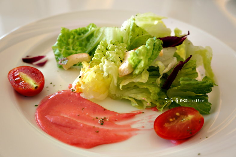 沙拉不特別但清脆新鮮,隨手一抹就很有藝術的草莓優格醬,酸甜爽口。