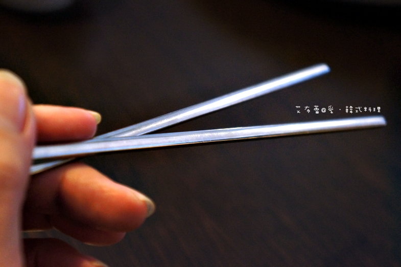 扁平的傳統韓國銅筷,雖然拿不順手,但一定要拿,這是吃韓國菜時必備的啦~