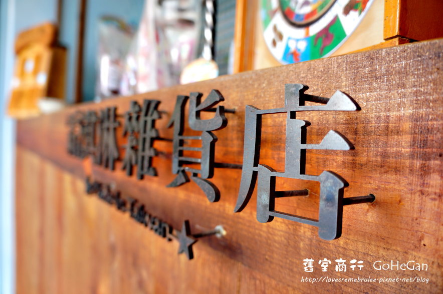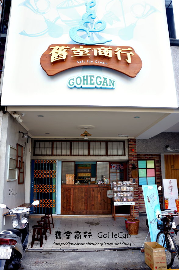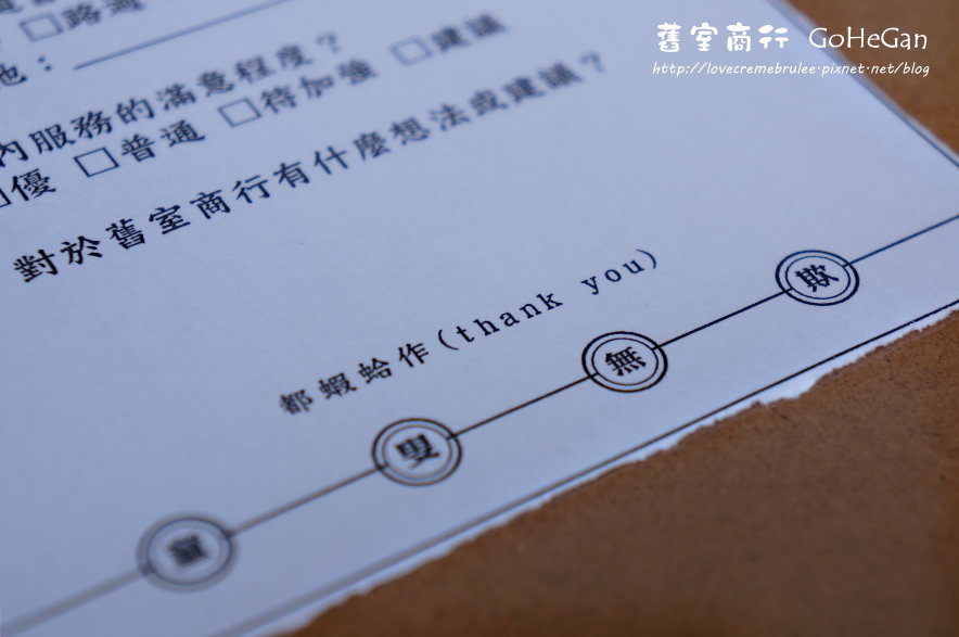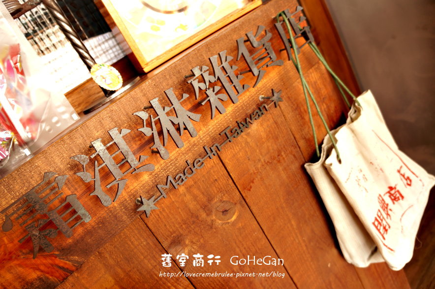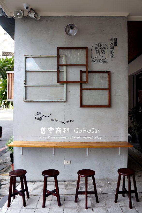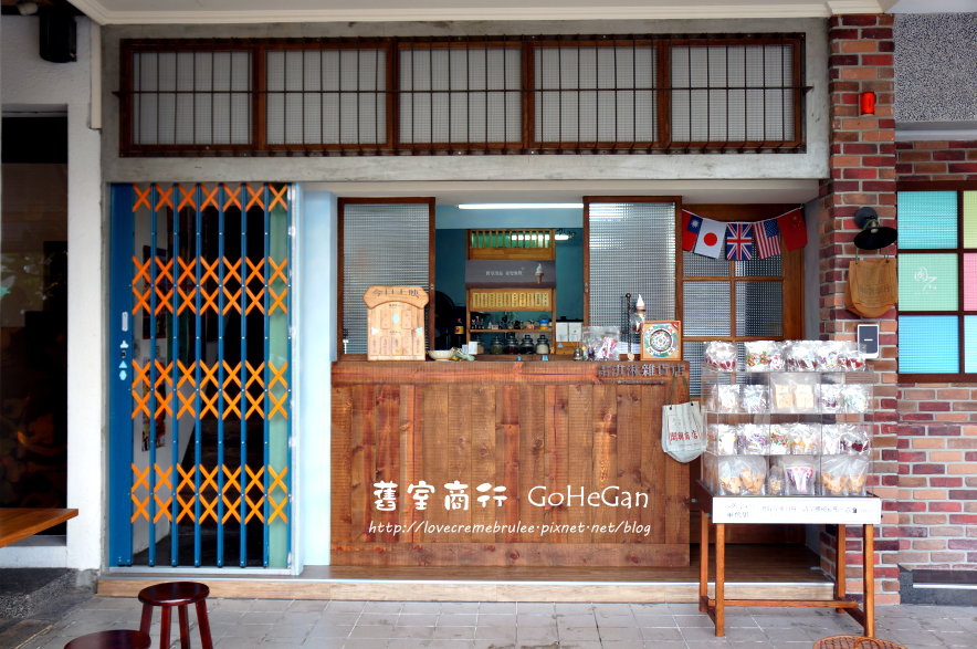 右上角的印了商標 "舊室商行 呷冰顧肺管" ,所以英文店名為 "GoHeGan" ...