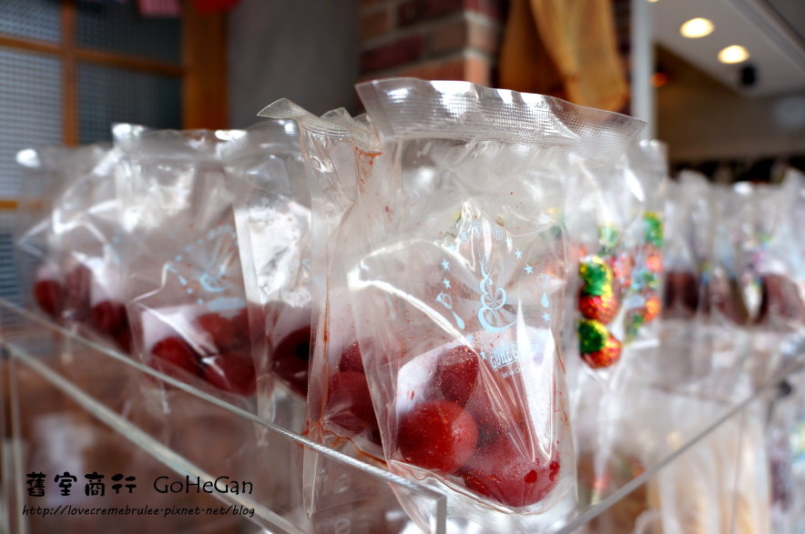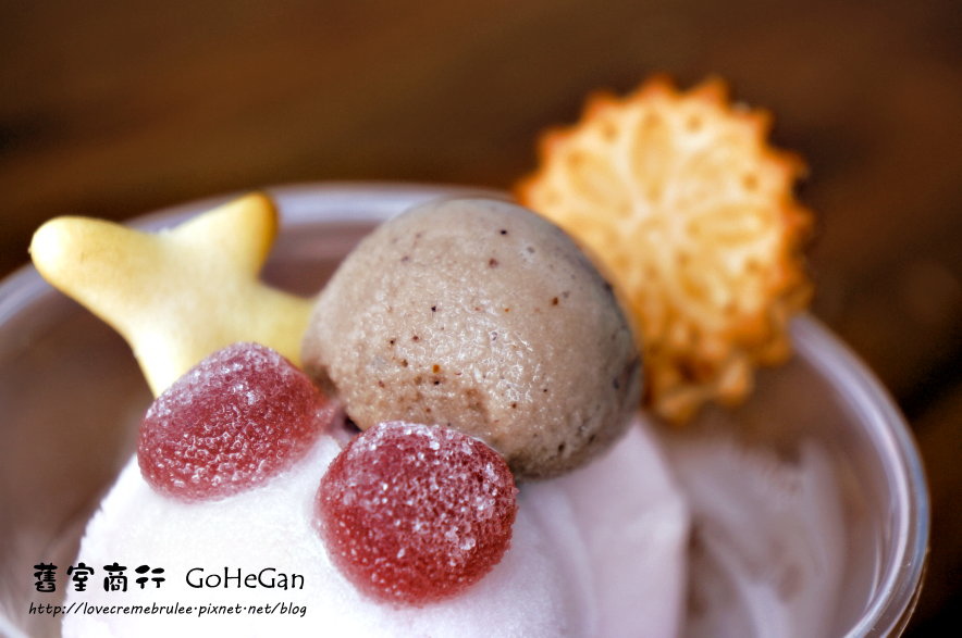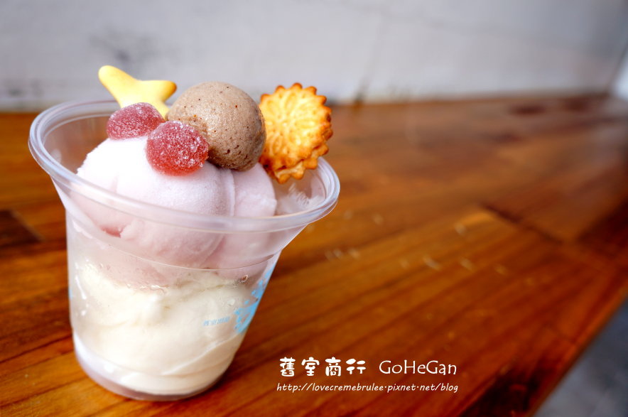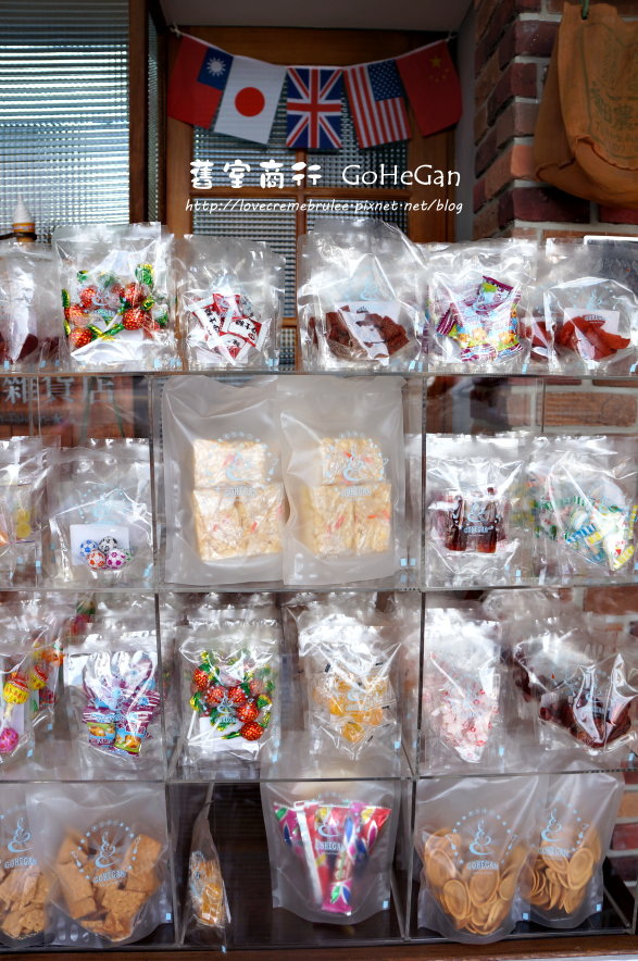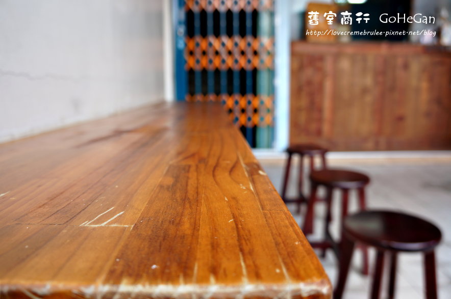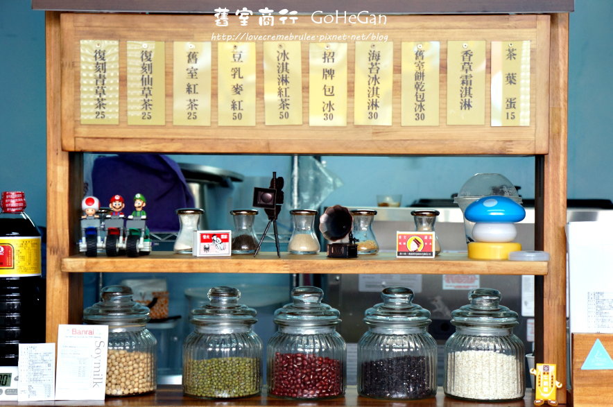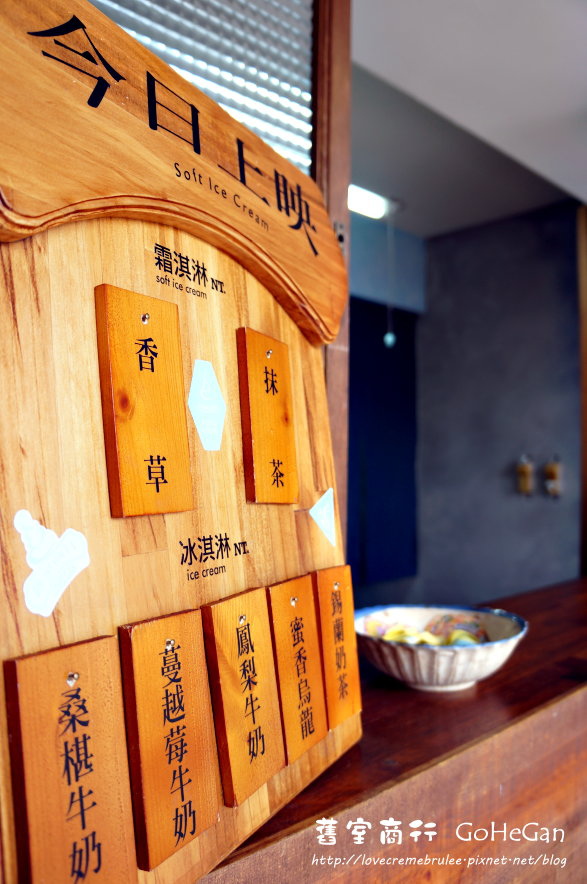 右上角的印了商標 "舊室商行 呷冰顧肺管" ,所以英文店名為 "GoHeGan" ...
