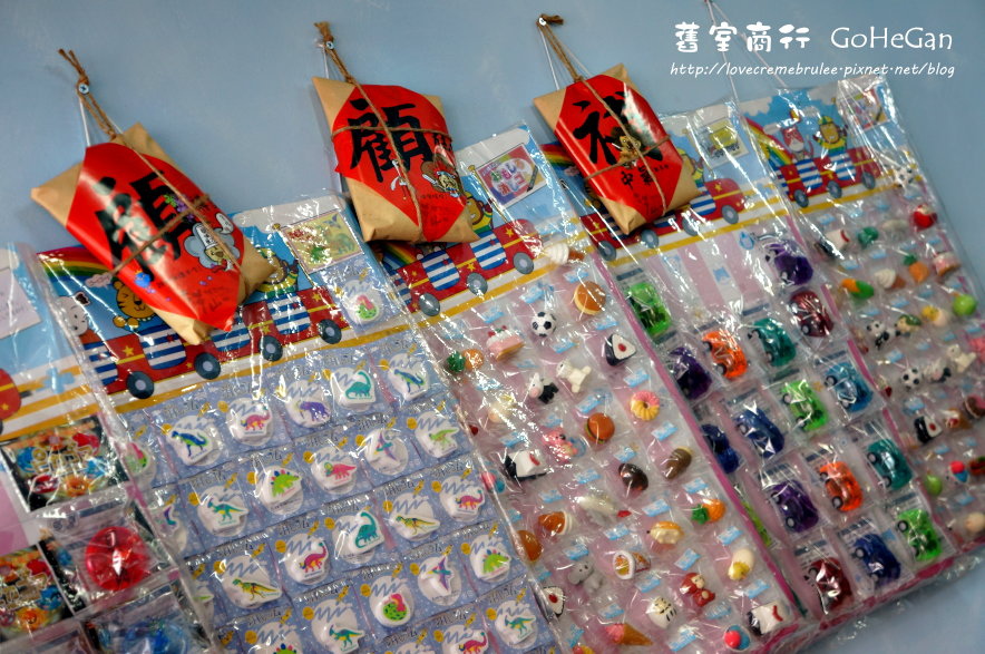 所以這裡也賣著小時候柑仔店的零嘴,辣橄欖、哨子糖...