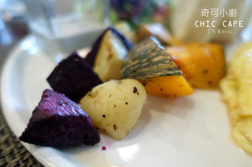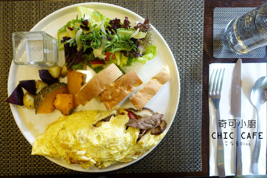 牛肉歐姆蛋、時蔬沙拉、烤蔬菜、佛卡夏麵包