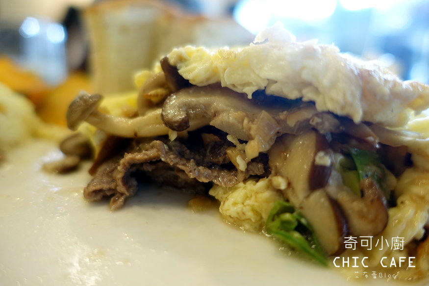歐姆蛋裡有紐約客牛肉片及香菇