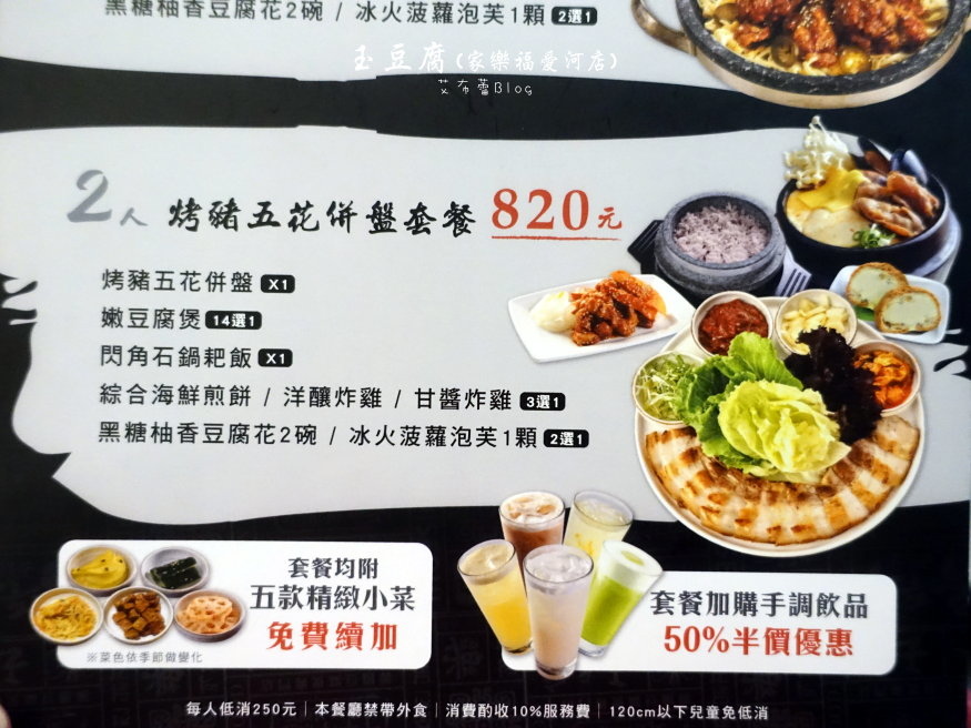 烤豬五花拼盤380、嫩豆腐煲250-290、閃角石鍋飯、甘醬炸雞190、黑糖柚香豆腐花30×2、飲料80-90×2
