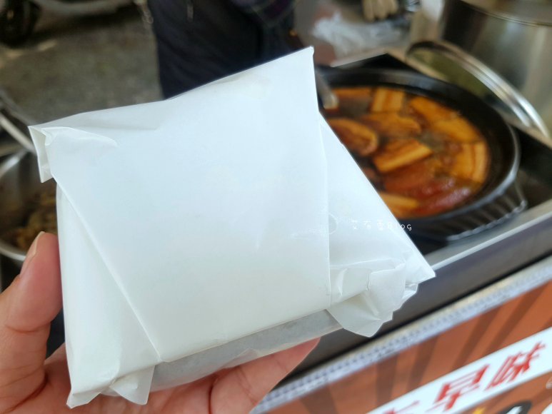 大口咬下去,先是明顯的酸菜味,再來才嚐到三層肉的滋味,肉的油香味有點被壓過去了...