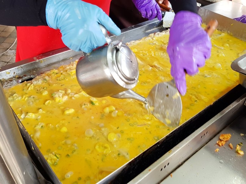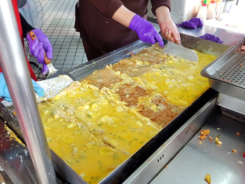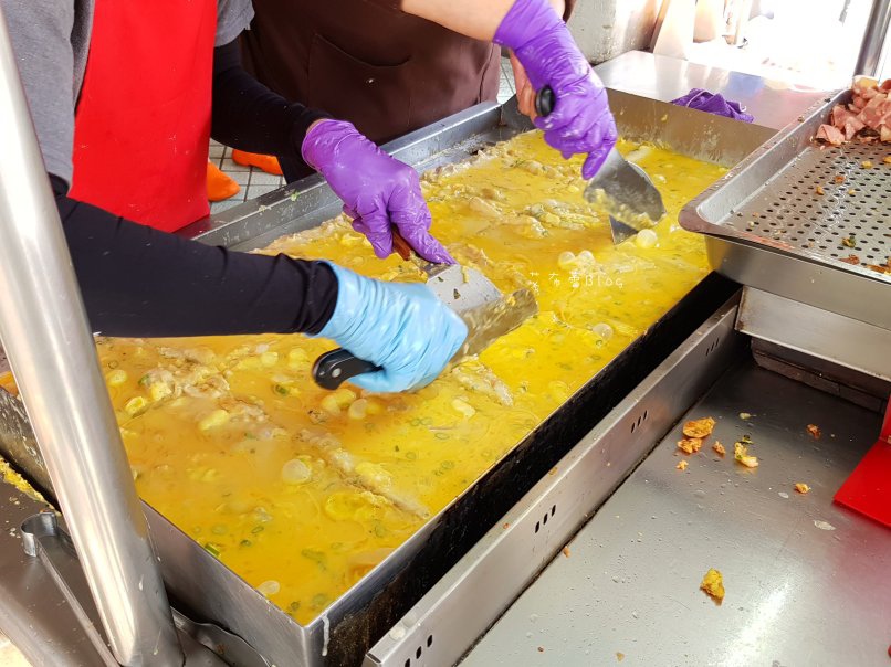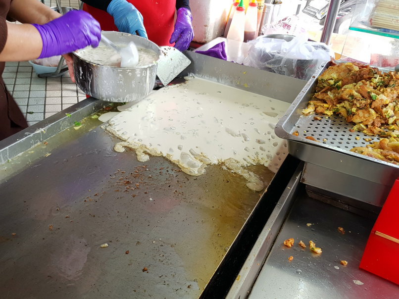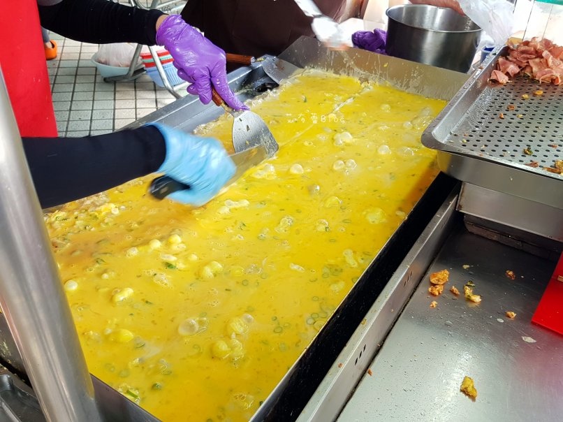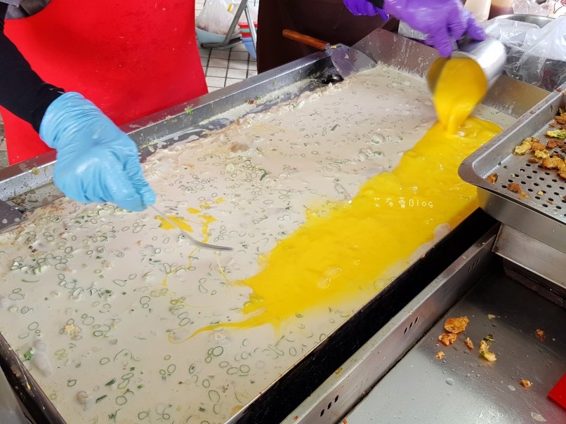 鐵板上鋪完一層麵糊後,再淋上蛋液
