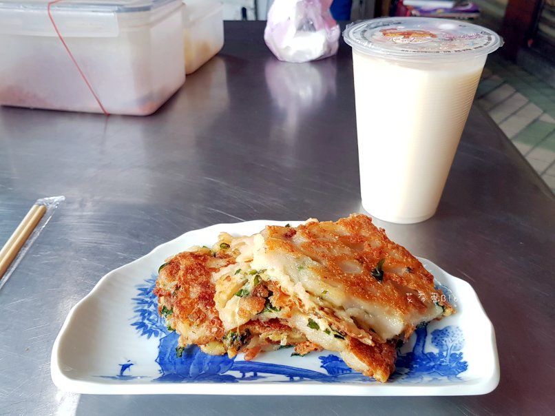 買了小份九層塔蛋餅和一杯微糖的熱豆漿