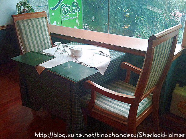 餐桌上的擺設很簡單大方,綠色的桌布配上綠色紋路的椅子,有紳士的感覺?