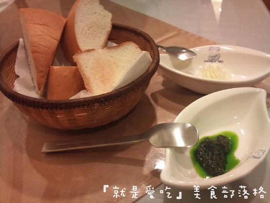 麵包本身熱熱軟軟的,最大的特色在於旁邊附的沾醬,有奶油醬及羅勒醬,
