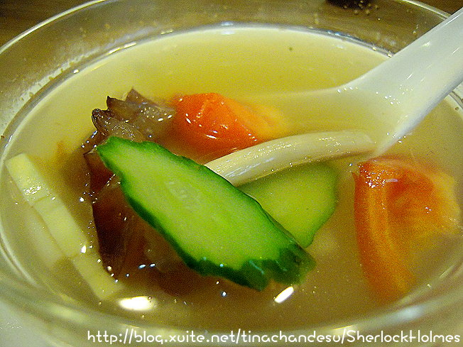 我想是一樣的湯頭吧,只是多了小黃瓜、木耳和蕃茄而已,雖不難喝,但也是無言的一道。