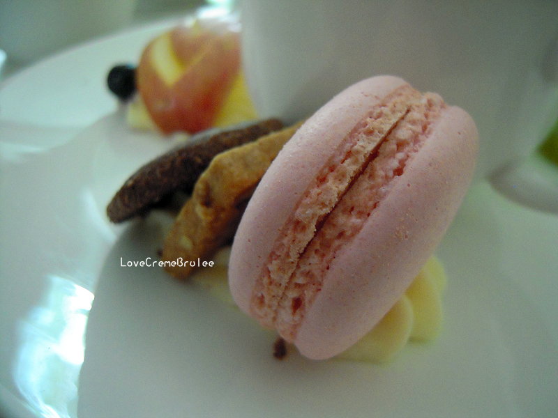 馬卡龍則值得贊許,外皮薄脆,麵包體酥鬆有Q度,且有濃濃的草莓香,帶了些果酸味,